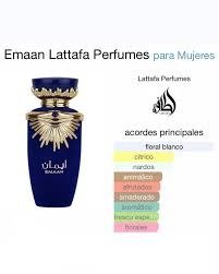 Emaan de Lattafa Perfumes es una fragancia de la familia olfativa Chipre Floral para Mujeres. Esta fragrancia es nueva. Emaan se lanzó en 2022. Las Notas de Salida son flor de azahar del naranjo, bergamota y grosellas negras; las Notas de Corazón son nardos, jazmín y caléndula; las Notas de Fondo son vainilla, almizcle, pachulí y cedro.