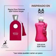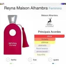 Reyna de Maison Alhambra es una fragancia de la familia olfativa Floral Frutal para Mujeres. Reyna se lanzó en 2023. Las Notas de Salida son mandarina, bergamota y toronja (pomelo); las Notas de Corazón son frambuesa, flor de azahar del naranjo y grosellas negras; las Notas de Fondo son malvavisco (bombón), crema batida, almizcle y almizcle ambreta.