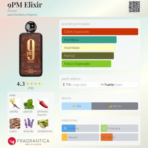 9PM Elixir de Afnan es una fragancia de la familia olfativa Oriental Especiada para Hombres y Mujeres. Esta fragrancia es nueva. 9PM Elixir se lanzó en 2025. Las Notas de Salida son cardamomo, nuez moscada y elemí; las Notas de Corazón son pimiento morrón, lavanda y cuero; las Notas de Fondo son vainilla, pachulí, ládano y heliántemo.