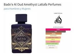 Bade'e Al Oud Amethyst de Lattafa Perfumes es una fragancia de la familia olfativa Oriental Vainilla para Hombres y Mujeres. Bade'e Al Oud Amethyst se lanzó en 2021. Las Notas de Salida son pimienta rosa y bergamota; las Notas de Corazón son rosa turca, rosa de Bulgaria (rosa Damascena de Bulgaria) y jazmín; las Notas de Fondo son madera de oud, ámbar y vainilla.